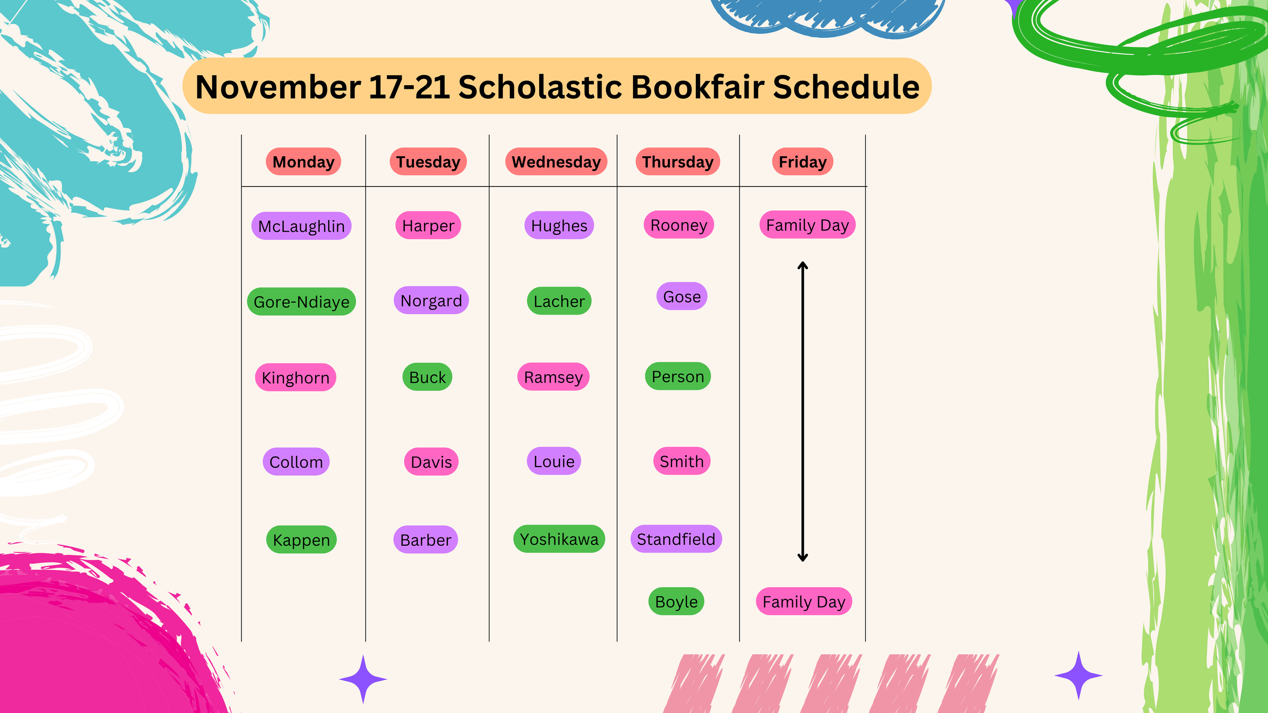 CHECK OUT WHAT DAY YOUR CLASS IS VISITING THE BOOK FAIR & SIGN UP TO VOLUNTEER!